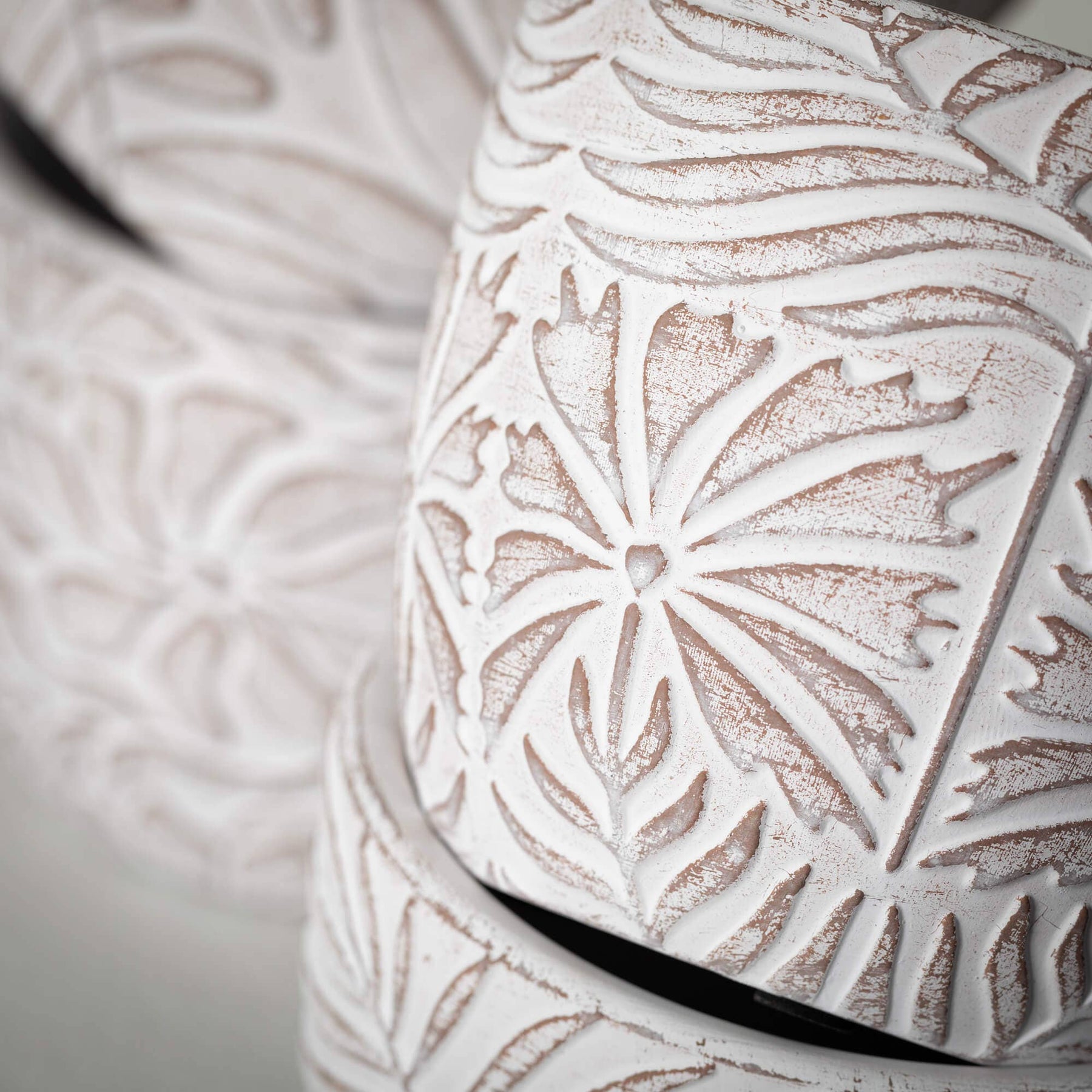 Add a touch of natural beauty to your decor with this Sullivans-exclusive terracotta planter set. Featuring artisanal etched organic prints, this four-piece terracotta set is great for displaying your favorite greenery indoors or out. White-washed botanical patterns.