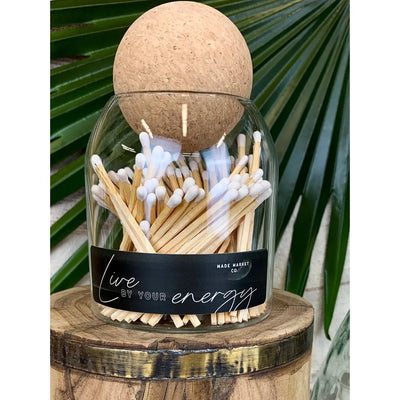 . 5.5" tall x 3.5" wide vessel (with cork top) • 110 matchsticks at 3 1/2" tall • unique cork ball topper .