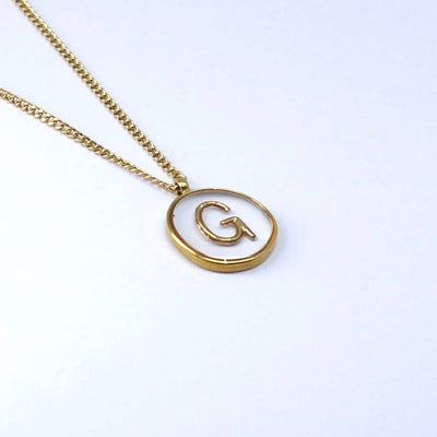 Adjustable gold steel necklace 50 cm long + 5 cm long with a round pendant made of transparent resin and initial letter in the center.
