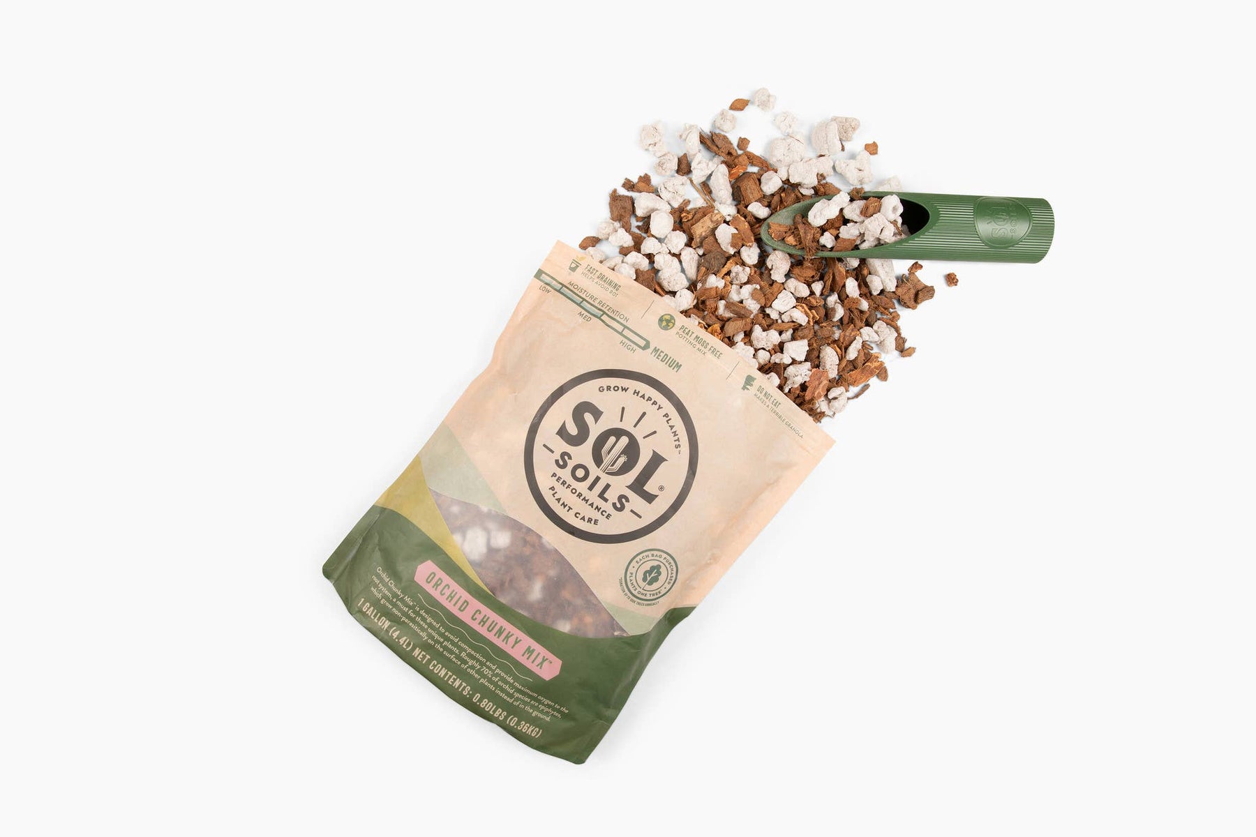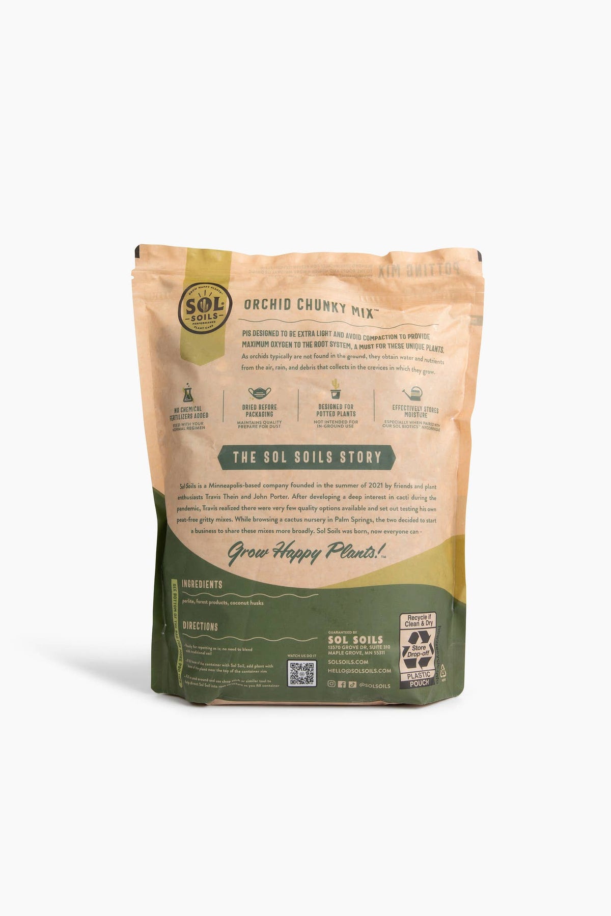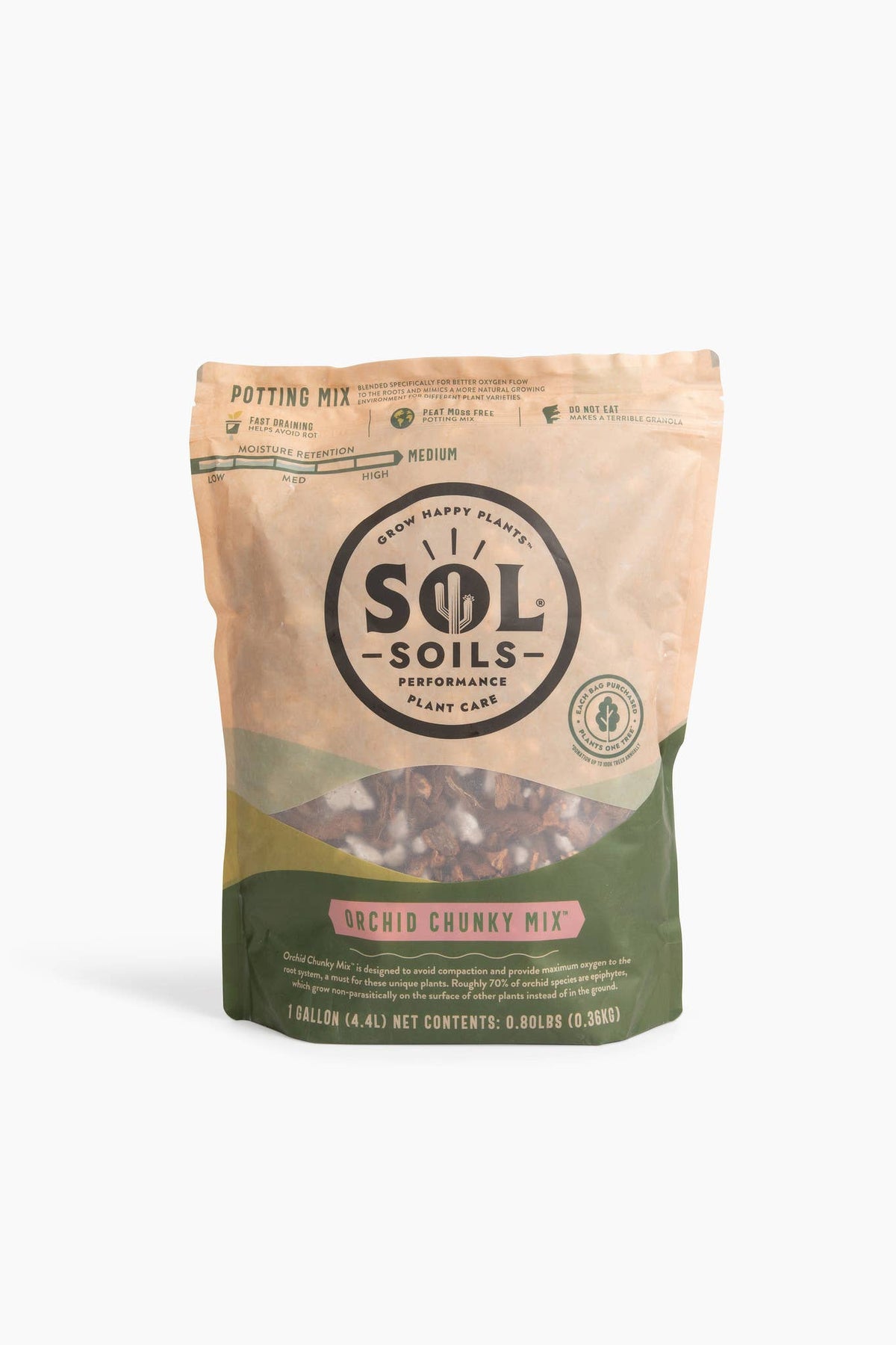 Sol Soils offers a variety of high-quality, gritty mix soils, soil amendments, and decorative soil toppers designed for the full spectrum of potted plants that may be in your collection. We select and hand-mix the best ingredients to produce fast draining soils that help protect against root rot, the number one killer of indoor plants. Orchid Chunky Mix is designed to be extra light and avoid compaction to provide maximum oxygen to the root system, a must for these unique plants. As orchids typically are not found in the ground, they obtain water and nutrients from the air, rain, and debris that collects in the crevices in which they grow. Soil Composition Organic: coconut husks, pine bark Inorganic: chunky perlite At Sol Soils, we are passionate about the beauty of plants and the natural world.