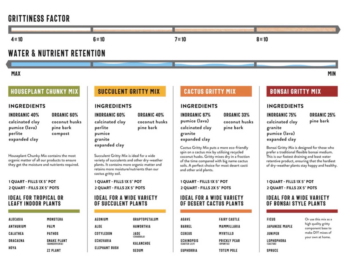 Succulent Gritty Mix is ideal for a wide variety of succulents and other dry-weather plants. It contains more organic matter and retains more moisture/nutrients than our cactus soil. This mix utilizes recycled coconut chips and coir, an otherwise wasted byproduct of the coconut industry. Of the 50 million coconuts produced around the world each year, about 85% of the husks are discarded as trash.