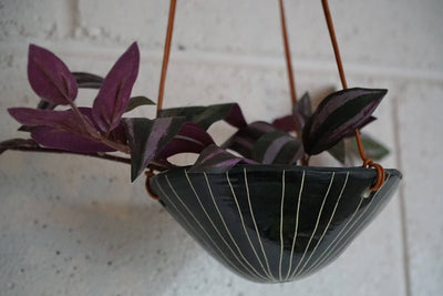 This small hanging planter is the perfect vessel for propogating, a tiny new succulent, air plants, etc. Bright white earthenware clay is hand-painted with a black underglaze and carved in the technique of sgraffito with a "Vertical Line" pattern. The planter contains a hole in the bottom for drainage and is glazed inside to keep the piece waterproof and protect any surface you hang it from.