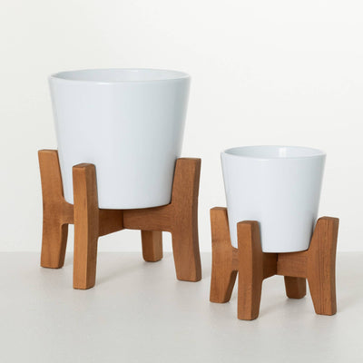 Elevate your indoor or outdoor decor with these White Planter Stands from Sullivans. Crafted with a chic white powder-coated ceramic body and light wood accents, these versatile stands add a touch of modern style to any space. A built-in drainage hole and included rubber plug are perfect for housing your favorite potted plants, greenery, or succulents. Sold in a set of two, these compact stands make it easy to create a cohesive, elevated display, whether you're dressing up a patio, porch, or living room. Versatile, durable, and decidedly on-trend, these Planter Stands are a must-have for any plant enthusiast or design-savvy homeowner.