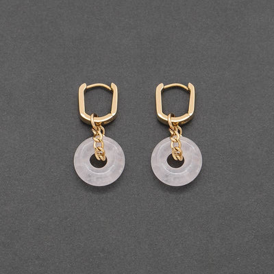 With their soft and soothing energy, these curls also fight against stress and anxiety and improve skin quality. Ideal for everyday wear or as an evening outfit Earrings with a natural stone in the shape of a donut hanging on a double chain. Material: 316L gold stainless steel jewelry, it will keep all its original shine and color thanks to its anti-allergenic and anti-corrosion properties.