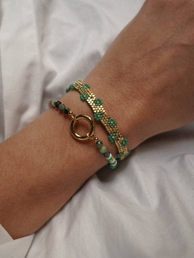 Steel bead bracelet with small flower patterns, length 17 cm Material: 316L stainless steel jewelry certified nickel-free, it will keep all its original brilliance and color thanks to its anti-allergenic and anti-corrosion properties. “Light Steel & Miyuki Arcadia” .